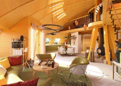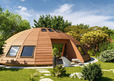 Véritable cocon lumineux en bois, le Domespace Cocon Solaris s’oriente avec le soleil pour offrir un confort thermique naturel tout au long de la journée. Idéal pour un couple ou une petite famille en quête d’harmonie avec la nature, il propose des espaces chaleureux, fonctionnels et baignés de lumière.