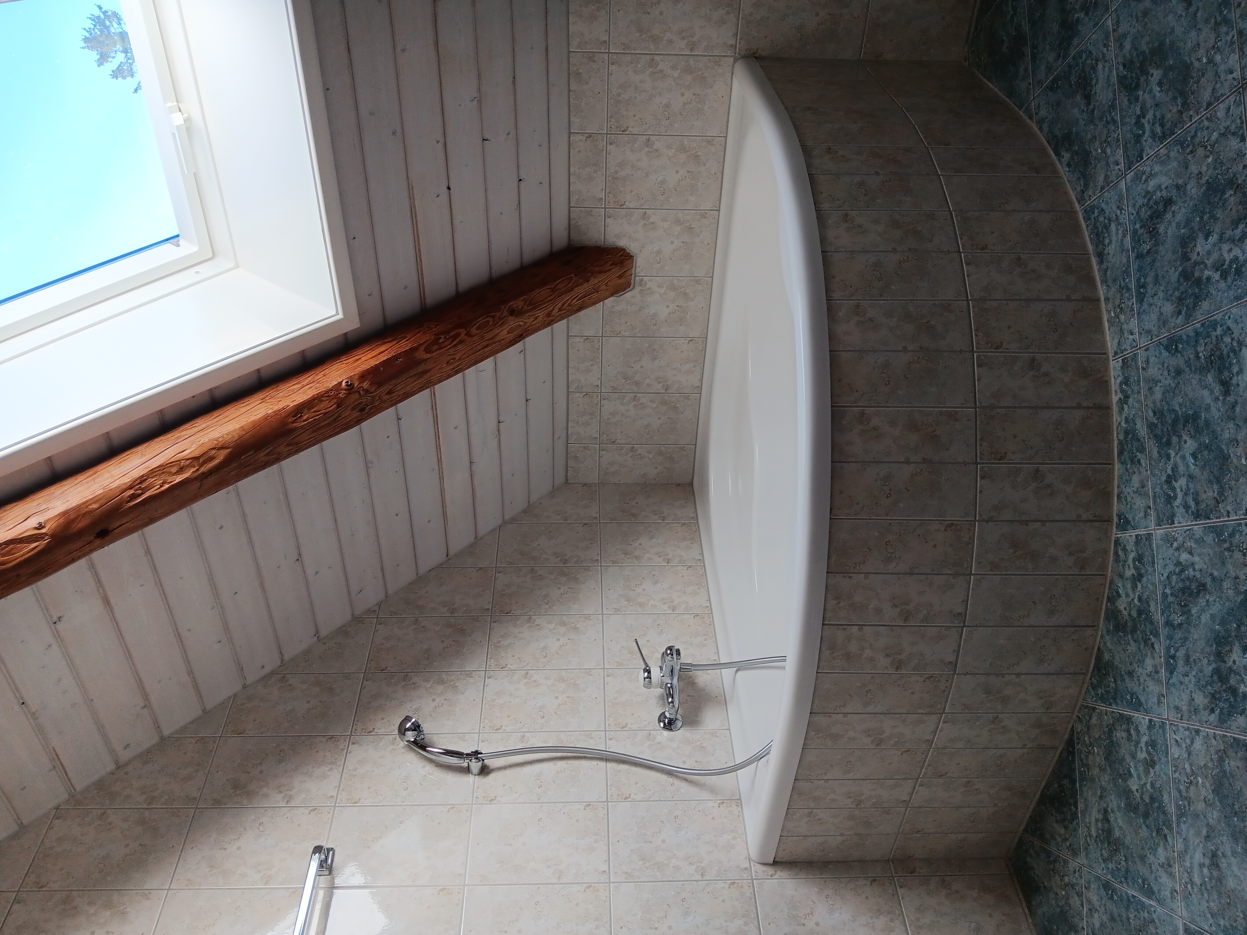 Salle de bains lumineuse — Baignoire d'angle, lavabo, WC